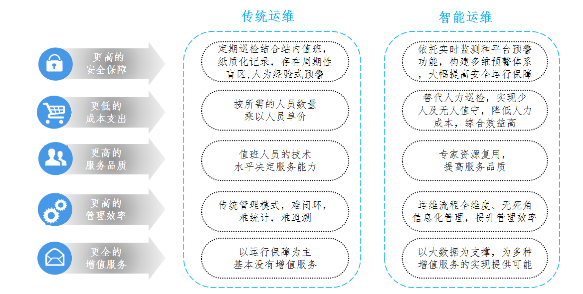 “智能運(yùn)維”也叫“智能電力運(yùn)維服務(wù)”,是傳統(tǒng)電力運(yùn)維結(jié)合“互聯(lián)網(wǎng)+”技術(shù)以及共享思維而產(chǎn)生的新型電力管理模式,通過(guò)線上平臺(tái)+線下運(yùn)維團(tuán)隊(duì)+APP,構(gòu)建新的運(yùn)維服務(wù)支撐體系,有效提升變電站運(yùn)行的安全、效率和經(jīng)濟(jì)性。